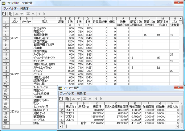 フロアの面積や家具、設備の集計などを自動集計。パソコンならではの機能も充実しています。納入業者との打ち合わせにも便利です。