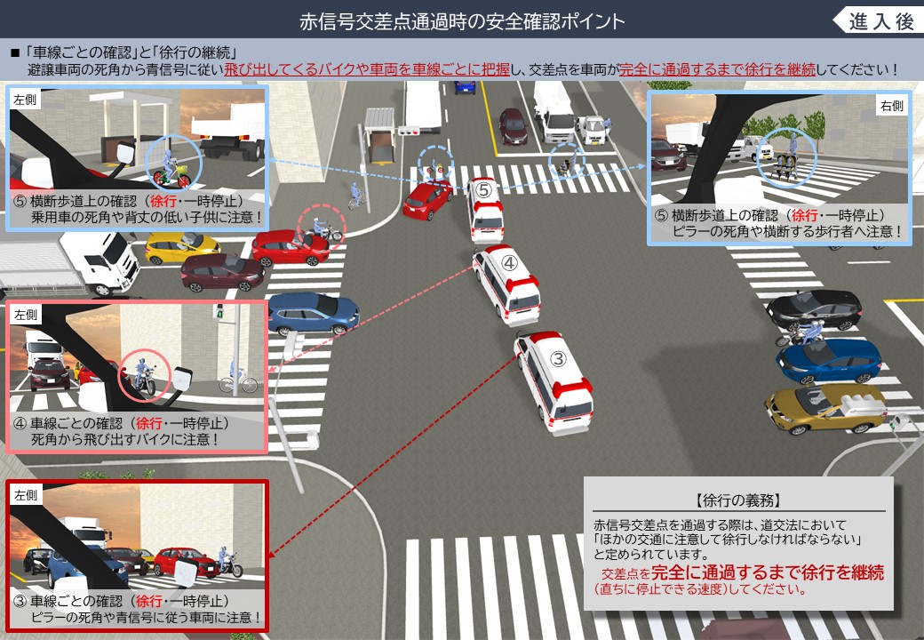 ▼赤信号交差点通過時の安全確認ポイント(提供:東京消防庁)