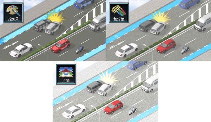 パースは「絵の具」「色鉛筆」「点描」に変換して書き出す事ができます。