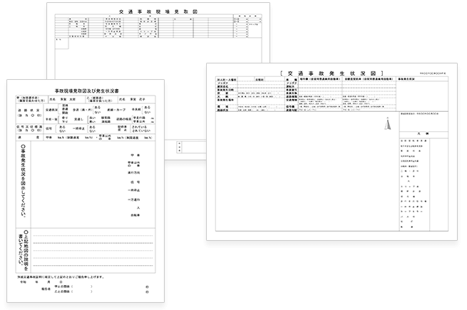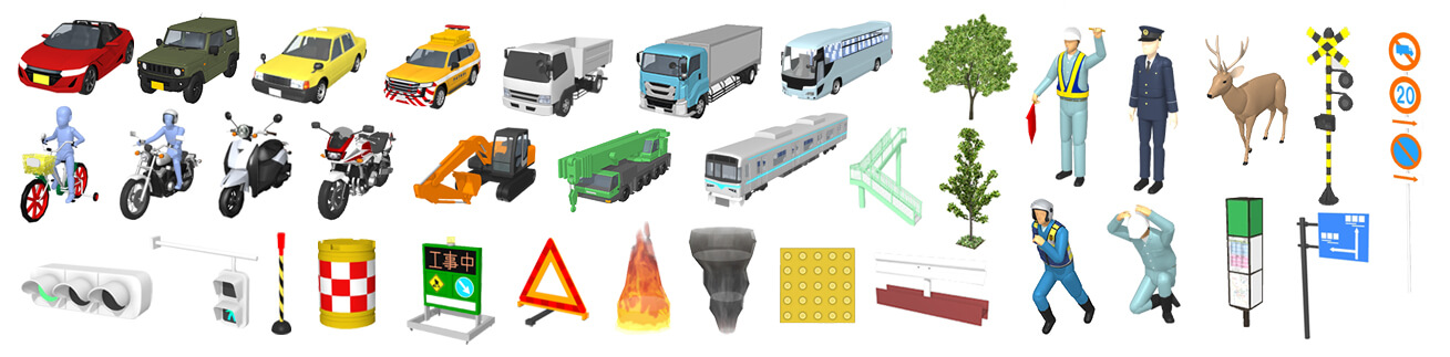 交通事故や交通安全講習資料で使える車や人物、信号などの実在パーツを約2,500点以上収録。