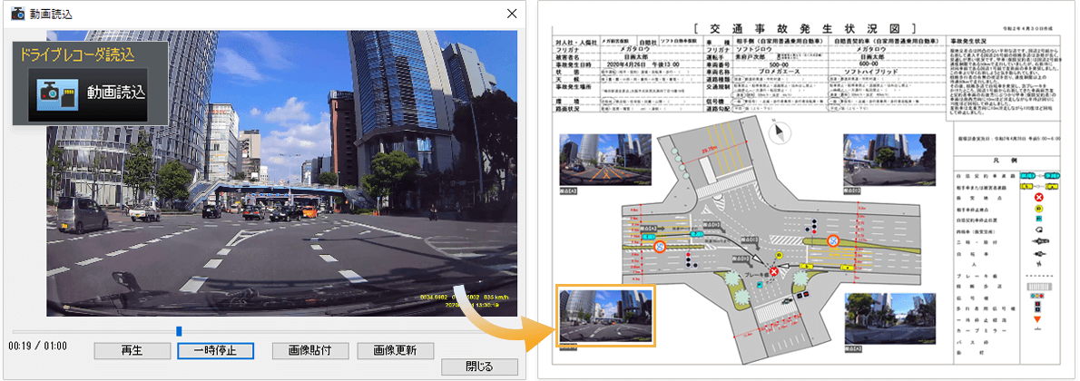 ドライブレコーダーに記録された動画を読み込み、必要な場面を静止画像として切り出すことができます。