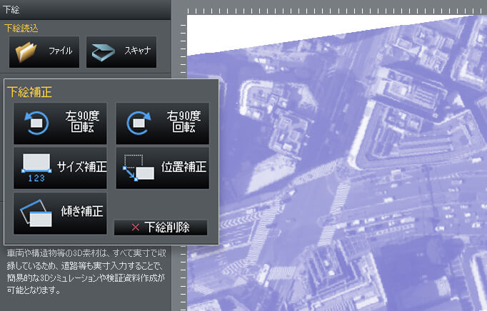 地図サイト等を利用して読み込んだ下絵は、実寸へのサイズ補正を推奨しています。車両や構造物等の3D素材は、すべて実寸で収録しているため、道路等実寸入力することで簡易的な3Dシミュレーションができます。