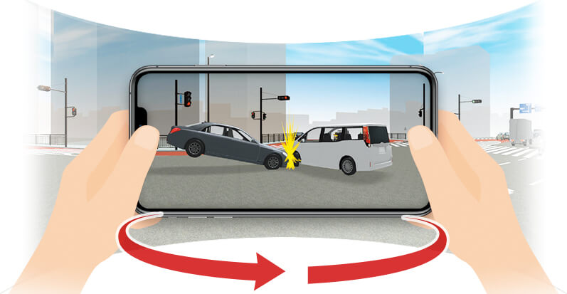 ルームミラー、サイドミラーに動画を貼り付けることで、映り込みの表現が可能です。これにより再現性の高い交通事故の映像を作成いただけます。