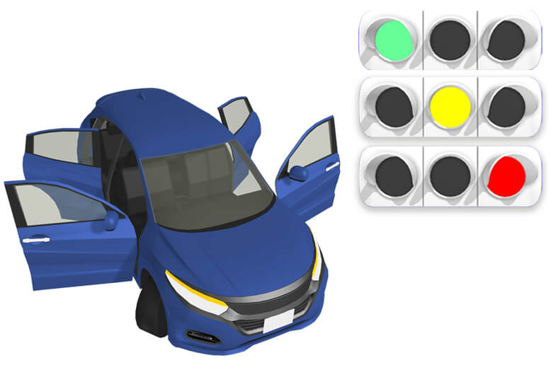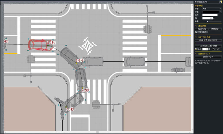 車両の方向指示ライトやヘッドライトの点灯・点滅タイミングの設定、信号機の灯火色変更や人物を歩かせる等、各パーツの動作も設定できます。