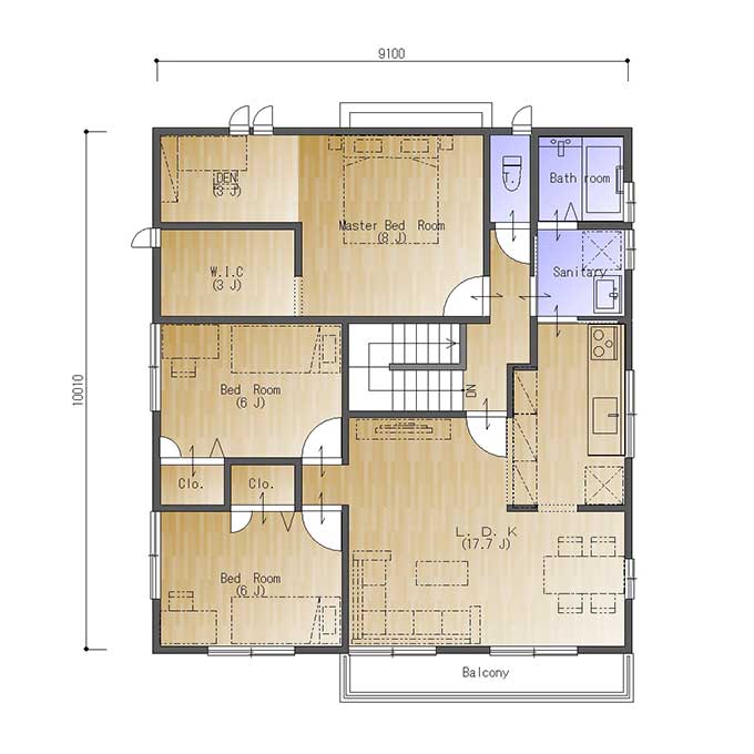 北玄関、東西の間口5.0間(9100㎜)、南北の奥行が5.0間(9100㎜)の参考プランです。