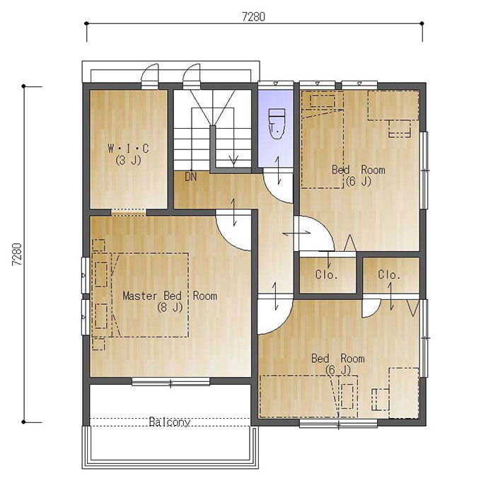 北玄関、東西の間口4.0間(7280㎜)、南北の奥行が4.0間(7280㎜)の参考プランです。コンパクトな建物ですがLDKは見ての通り十分な広さがとれています。玄関ホールや二階廊下を極力小さくして部屋を大きくする工夫をした間取りです。