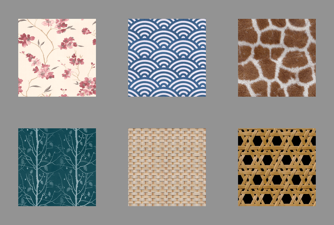 ▼左上から (「壁紙U010.mtb」「布V104.mtb」「毛皮U005.mtb」 「壁紙U051.mtb」「竹O03.mtb」「竹L05.mtb」)