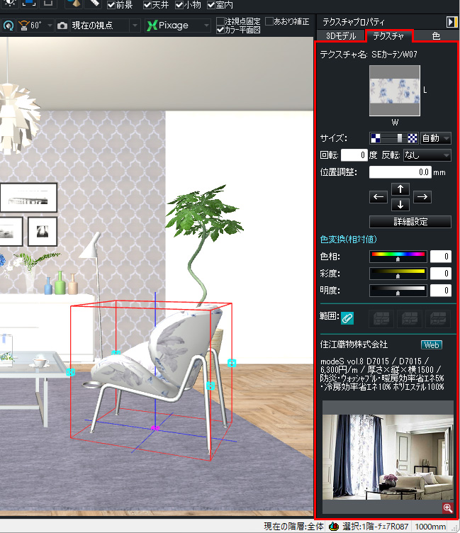 ▼選択されているチェアの張地の情報が操作画面右側の「テクスチャパレット」に表示されます。