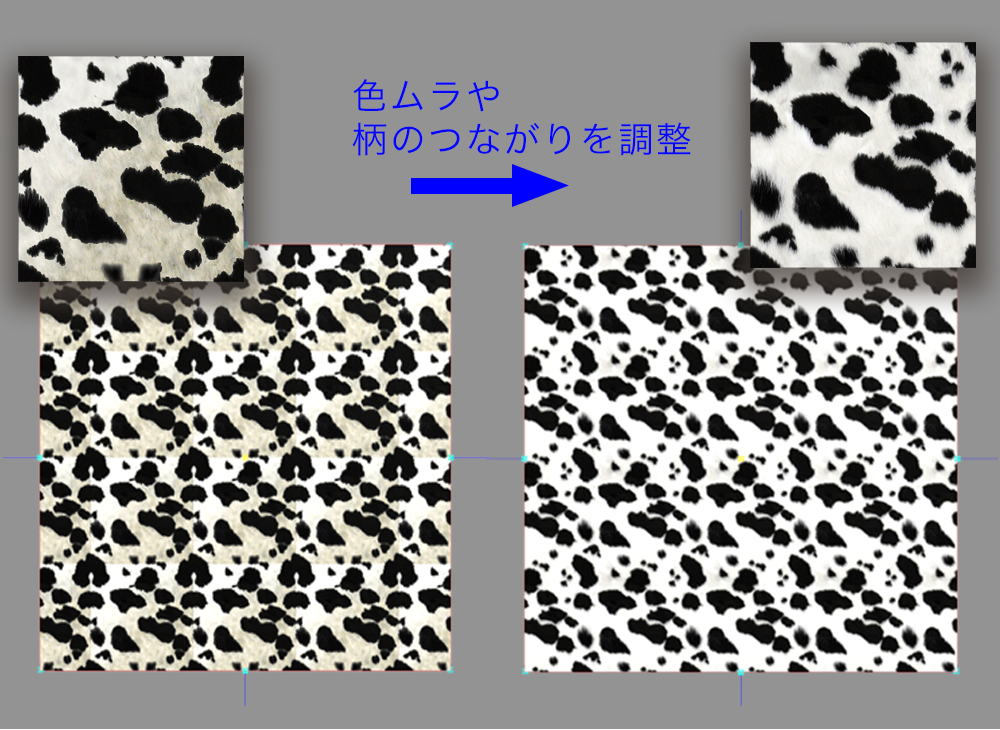 その場合は、画像編集ソフトを駆使して均一化したり、模様や余計な陰影を省いたり、一部を手で描き加えたりして、タイル状に並べた時に柄がうまくつながるように調整したりします。