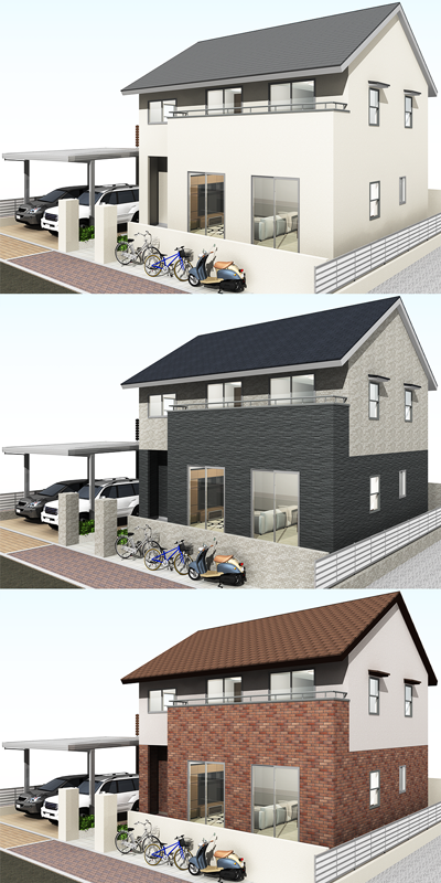 外壁材のカタログを見ているだけではイメージできない、ってときも、CGならテクスチャを変えてシミュレーションが可能、イメージしやすくなります。