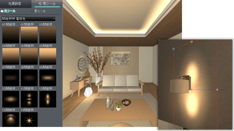 照明器具の近くや床・壁面にドラッグ&ドロップするだけで、間接照明やスポットライトのような光の演出を手軽に追加できます。