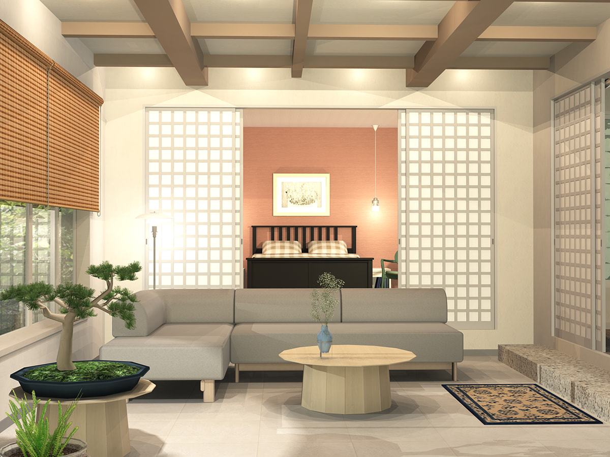 今回はジャパンテイストの家具のうち素敵なソファ(KMソファセットAF01)とテーブル(KMテーブルAF04)をメインに据えたビジュアルを作ってみました。
