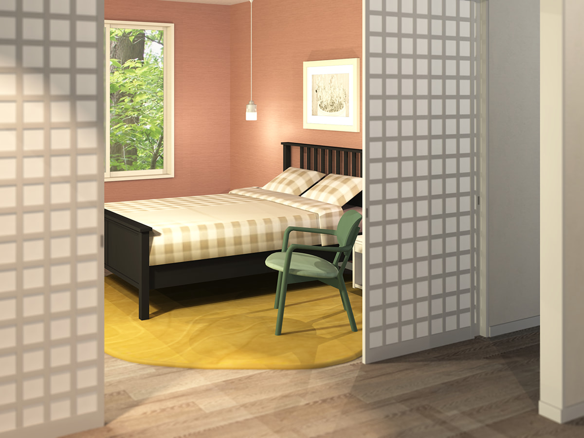 間取りは田の字プランで8帖の空間を4つ繋げたものです。間仕切りの建具は格子デザインで和テイストを表現。奥に見えるベッドルームには低めのチェア(KMチェアAF06)も置いています。