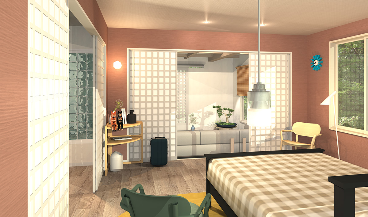 そんなトレンドと日本の古くからの間取りを生かしてリノベをした宿泊施設を想定して、今回は空間を作ってみました。
