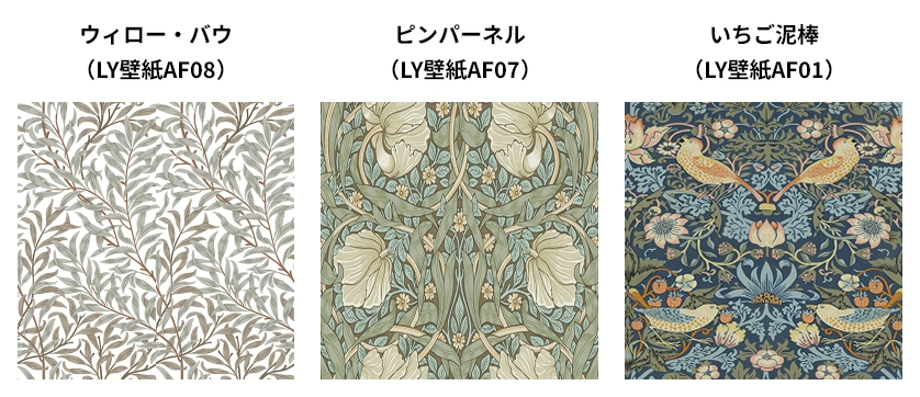 言わずと知れた「いちご泥棒」(LY壁紙AF01)の柄を貼りました。1883年のデザインです。