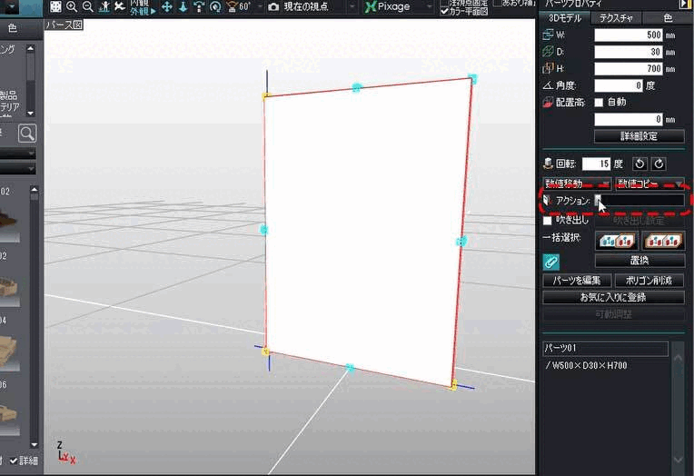 ③右クリックメニューから「パーツ配置基準点設定」で基準点を蝶番の側に設定