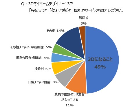それを裏付けるように、直前のバージョン「3Dマイホームデザイナー13」のユーザーへのアンケートでは、一番「便利と感じた」機能として、49%の方が「立体化して見られる」点だと回答しています。