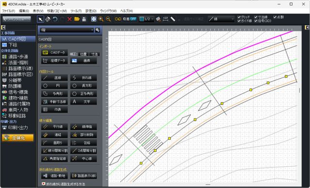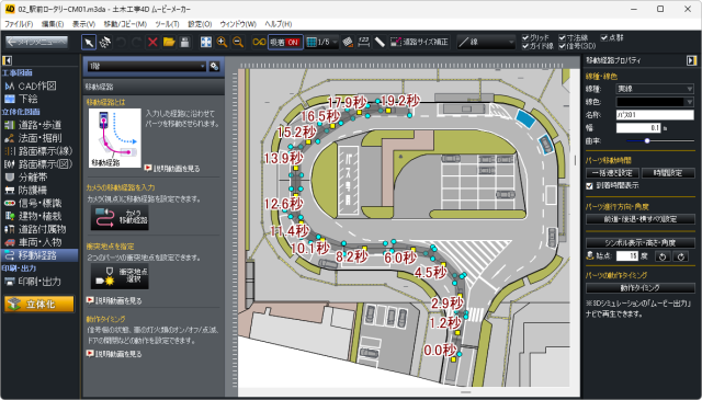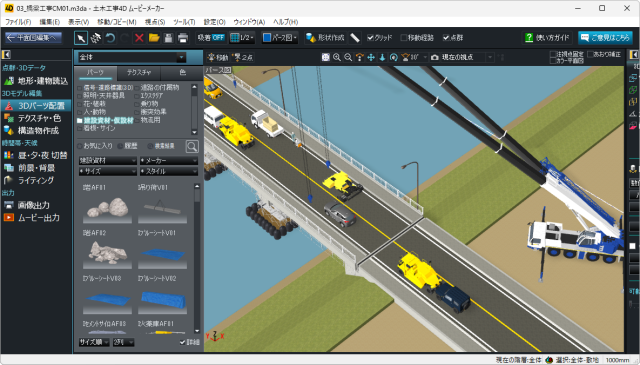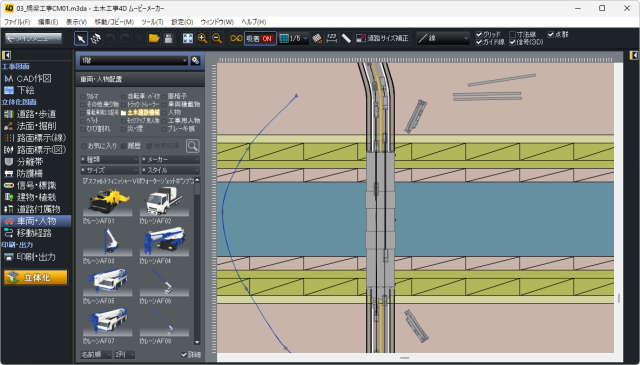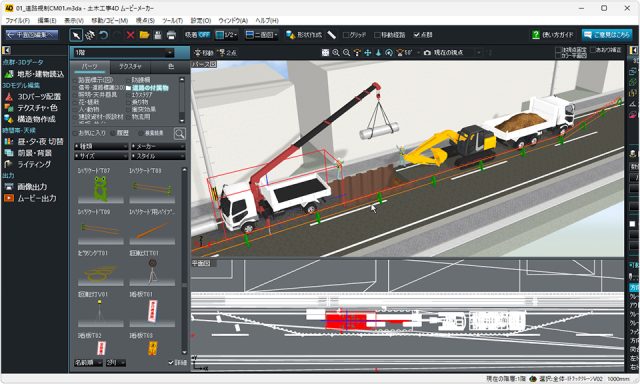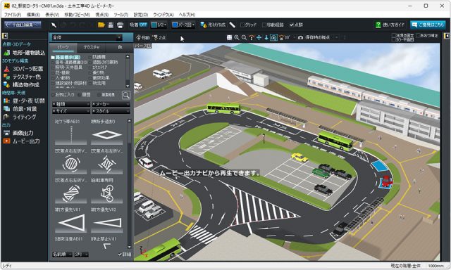 本ソフトは、点群やCADデータを読み込み、自由に道路を作成することで、現場を3DCGで素早く再現、各部品に動きと動作時間を設定することで動画を作成可能です。