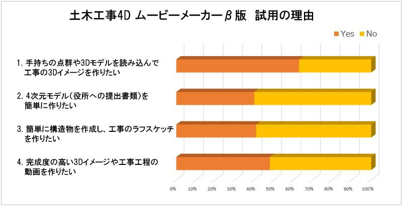 ▲β版試用理由で最も多かったのが「手持ちの点群や3Dモデルを読み込んで工事の3Dイメージを作りたい」、次いで「完成度の高い3Dイメージや工事工程の動画を作りたい」となり、3D/4Dを作成したいユーザーが多いことがわかった(複数回答) -
