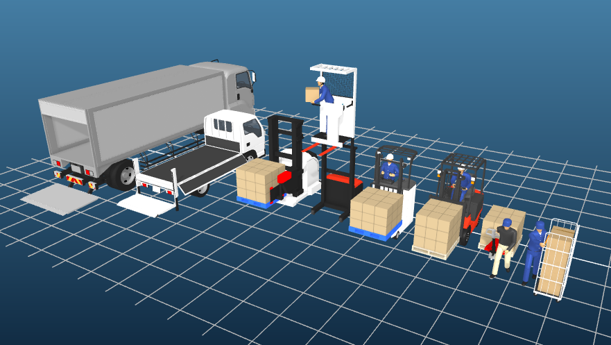 この度公開した最新バージョンでは、昨今、倉庫や工場の敷地内で多発している、荷下ろし時の事故や倉庫用車両と運搬車両の接触事故等を再現しやすくするために、フォークリフトやトラックなど物流倉庫業向け車両の3D素材を追加しました。