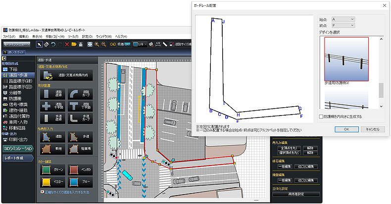 描いた道路や交差点の設置したい辺に指定した防護柵を一括配置できるため、操作の手間を大幅に削減できる