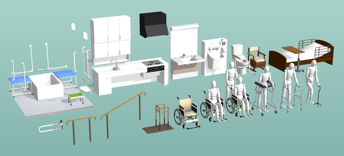 ▲3Dデザイナーシリーズで使用できるよう福祉用に浴室、キッチン、洗面、トイレ回り、寝室などの設備や家具類、手摺やスロープ、人物など430点以上を収録した。
