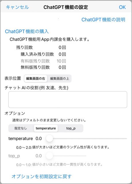 日常のメモ書きはもちろん、仕事でも使える本格的なテキストエディターでもある本アプリがChatGPTに対応することで、文書の変換・校正、情報収集、ソースコードの自動作成が可能となります。ChatGPT機能は、無料版では10回まで試用でき、有料版では毎日10回まで利用可能、さらに頻繁に利用したい方向けに100回単位で課金購入のプランも用意しました。