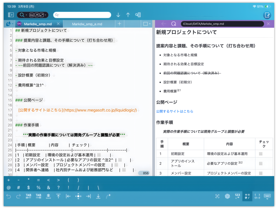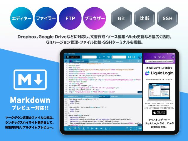 メガソフト株式会社(本社:大阪府大阪市、代表取締役:井町良明)は、2019年5月より公開しているiOS用テキスト編集アプリ「LiquidLogic」において、Markdownファイルのプレビュー機能を追加した最新版を公開しました。
