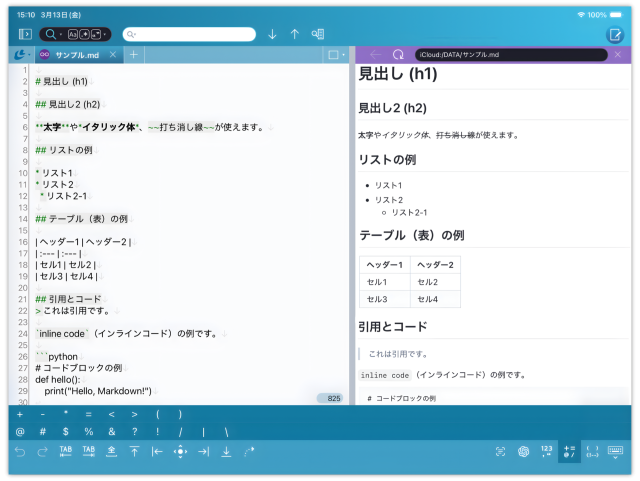 今回のアップデートでは、Markdownファイルの編集内容をリアルタイムに表示する「プレビュー」機能や、特有の記述を色分けなどで分かりやすく表示する「シンタックスハイライト」に対応しました。これにより、Markdownの記述内容と表示結果を同時に確認しながら文書作成を進めることができ、マークアップ形式でのテキスト編集を、iPadやiPhone上でより快適に行えるようになりました。