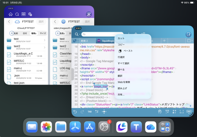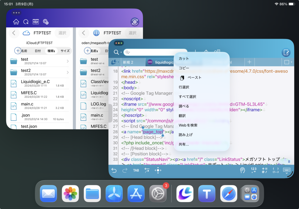 iCloud、Dropbox、Googleドライブ、OneDriveに対応し、オフィスや自宅のパソコン作業との連携も可能。ファイラー、FTP、Webブラウザー機能も搭載しているため、外出先でも手のひらでWebページの修正作業が行えます。