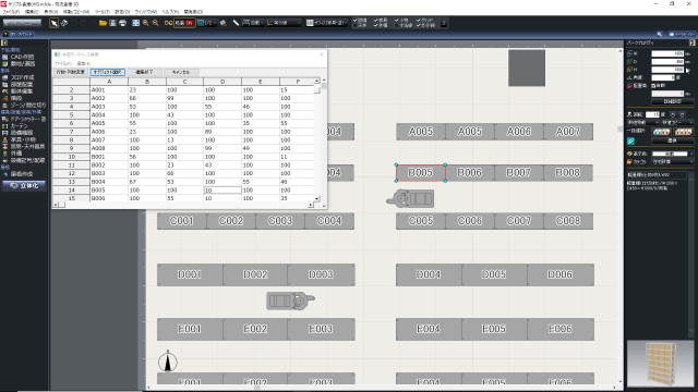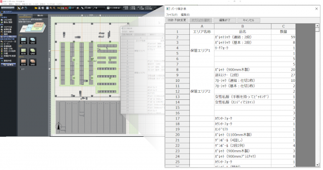 平面図に配置したパレットや段ボール、フォークリフトなどのマテハン機器の種類や数を自動的に拾い出し、表計算ソフト用のデータとして出力できます。平面図上でエリア設定を行えば、エリア毎の数量拾い出しが簡単に行えます。