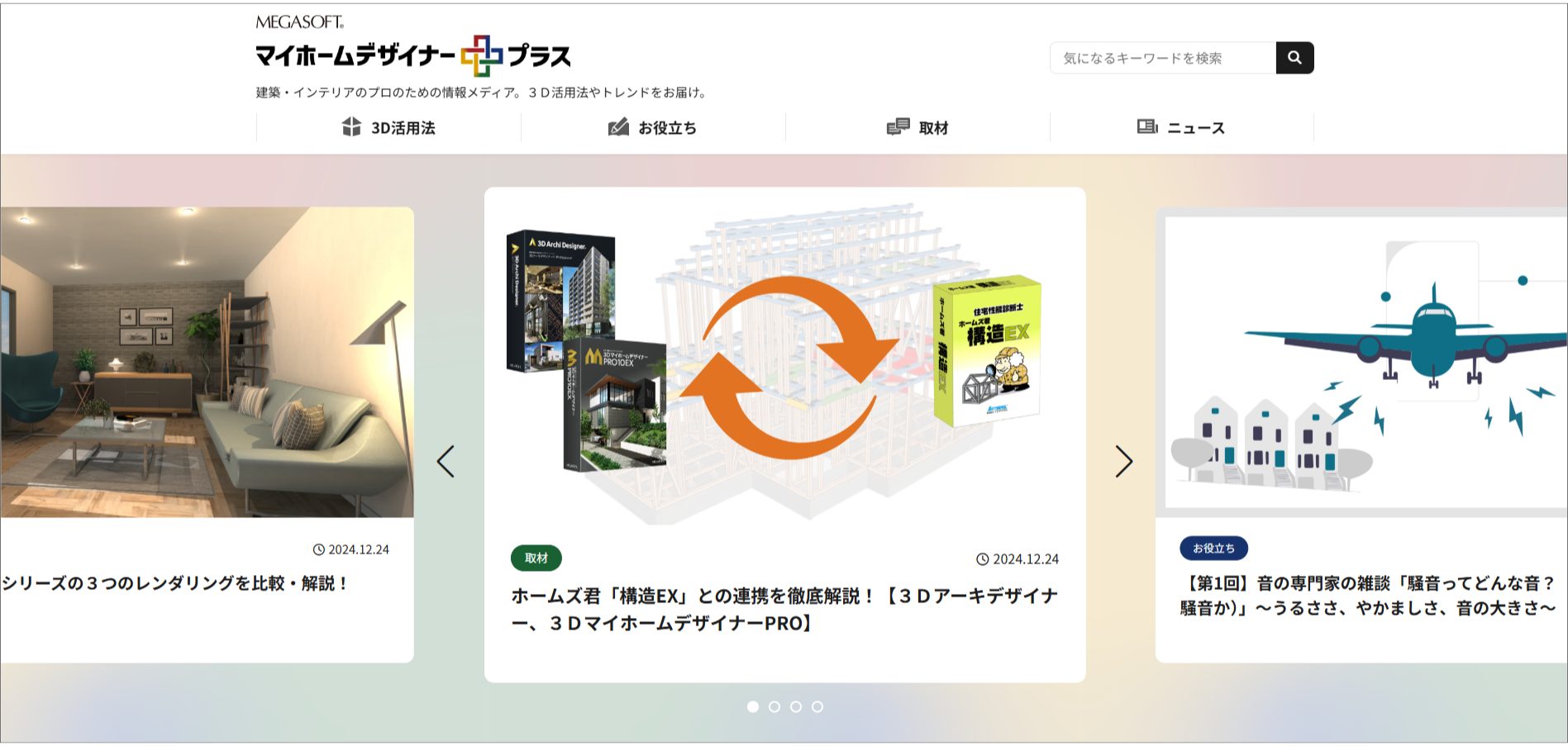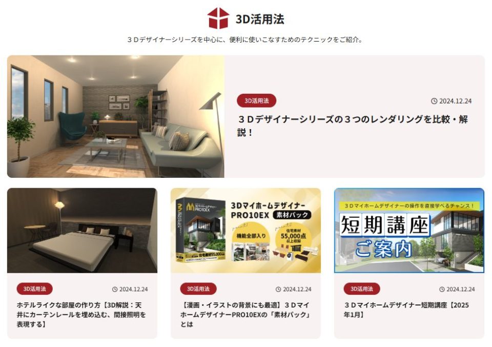 最新の記事では、3Dデザイナーシリーズのレンダリング機能の比較や、住宅性能診断士ホームズ君「構造EX」(開発:株式会社インテグラル)との連携など、日頃からお客様からお問合せが多い内容を中心に解説しています。