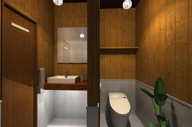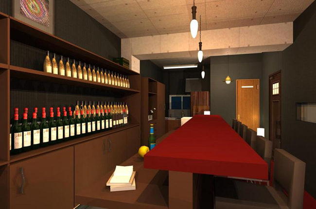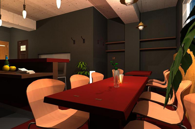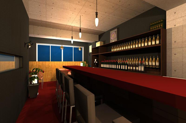 『ショットバー』 夜の時間帯にオープンするので、背景を夜の設定でパースを立ち上げました。 店内は落ち着いた雰囲気になるように、トーンを落としました。トイレは清潔感のある、モザイクタイルでまとめました。