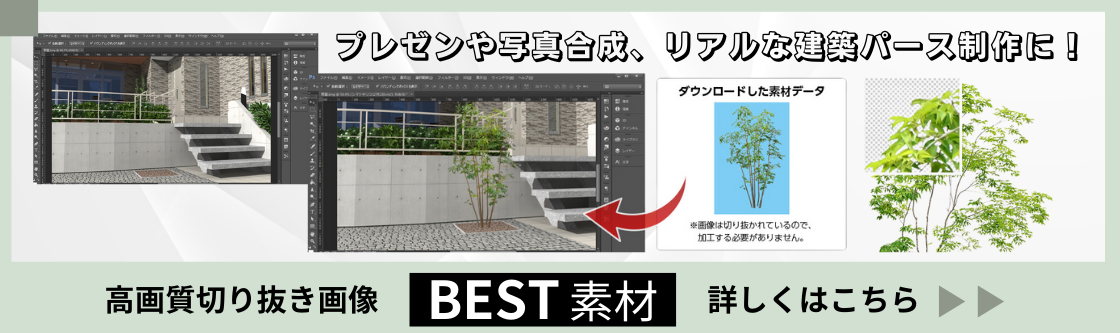 プレゼンや写真合成、リアルな建築パース制作に、すぐにお使いいただけます。