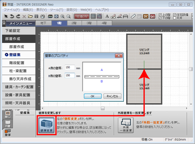 壁厚変更をクリックして、変更したい壁をクリックします。