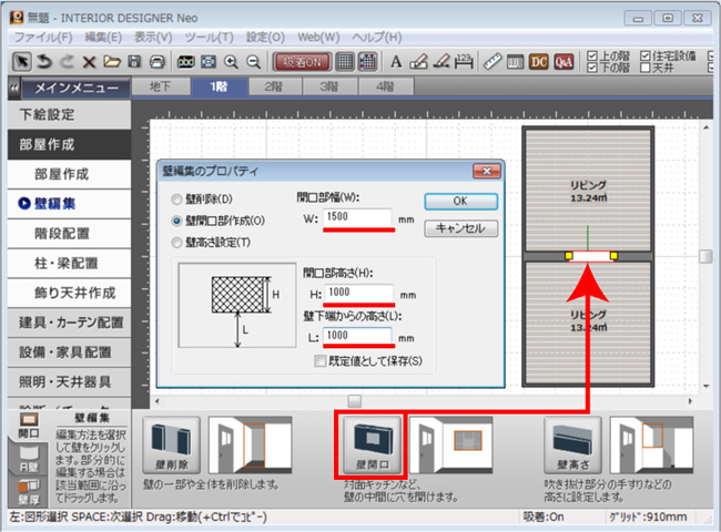 作成した開口部分をダブルクリックして「壁編集のプロパティ」を表示させ、ニッチとなる範囲の数値を入力します。