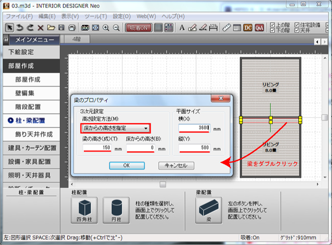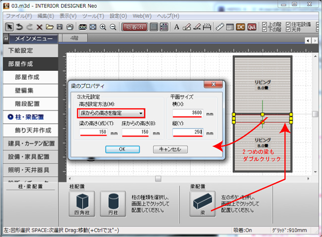 「インテリアデザインナビ」から「柱・梁配置」を選択し、梁配置ボタンをクリックして下のリビングの部屋に「梁」を配置します。