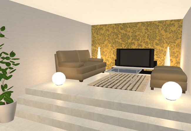 ナビから「内装材設定」の「床材設定」を選び、「テクスチャ」タブの「床材」からフロアタイルを床に貼りつけて、終了です。