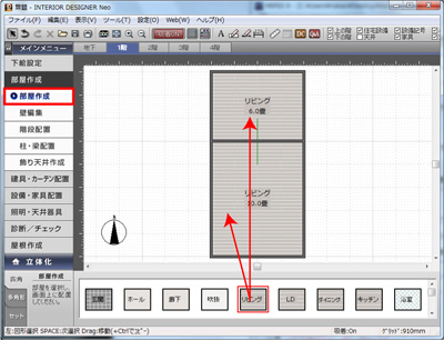 間取り画面のナビから、「部屋作成」を選択し、部屋を2つ配置します。 |
