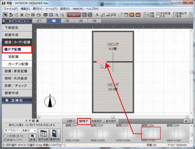 間取り画面のナビから、「ドア配置」を選択してパレットから「室内ドア」の