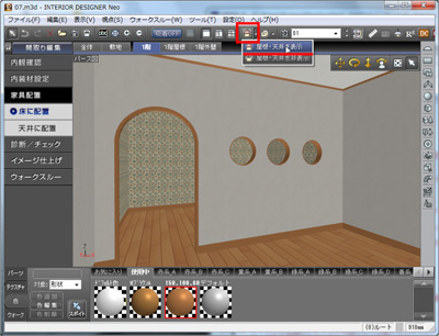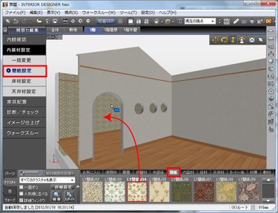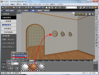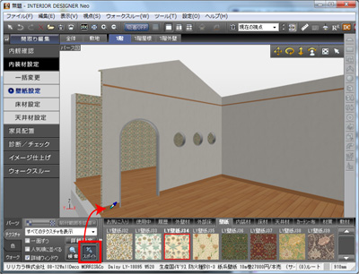 ナビの内装材設定から「壁紙設定」を選択して奥側の部屋に壁紙を貼ります。 |