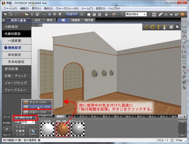 クリックした色がパレットの使用中タブに表示されます。アーチ型の壁開口の枠を幅木と同じ色に変更し、その直後にパレットの「貼りつけ範囲を拡張」の「フロア全体に反映」を選択するとアーチ型の枠が全て同じ色に変更されます。