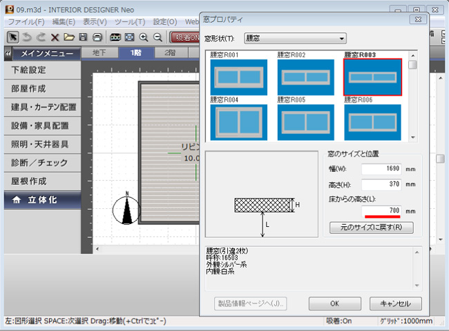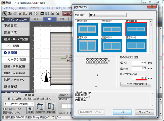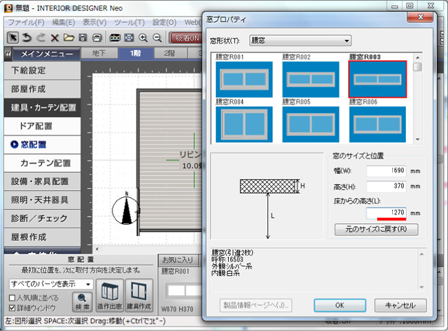 建具・カーテン配置の「窓配置」を選択してパレットから腰窓タブより
