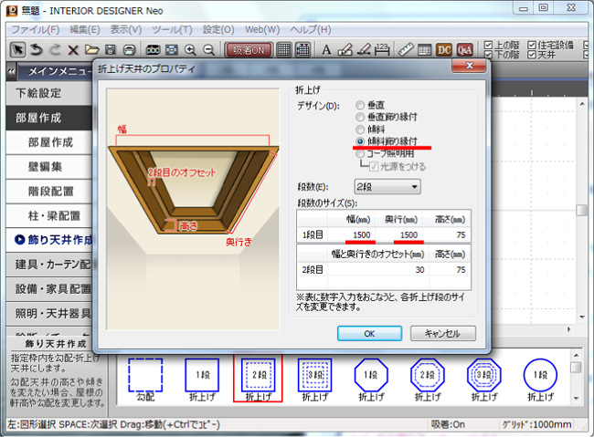 飾り天井作成ナビを選択してパレットから「折上げ2段」を選び部屋に配置します。 |