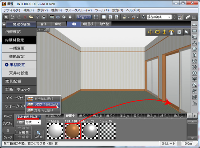 パース図表示にします。壁紙設定ナビを選択して壁紙を貼ります。 |