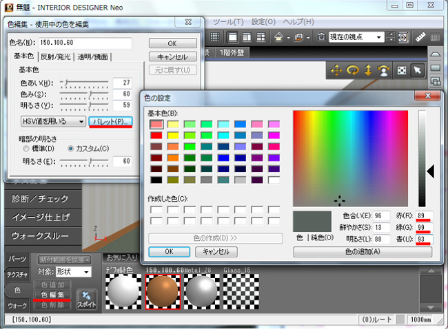 幅木に設定されている色が「使用中」タブにあることを確認して色パレットの「色編集」をクリック。パレットから「色の設定」を選び、数値を変更します。