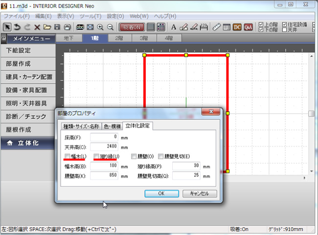 「立体化設定」を選択して「幅木」「廻り縁」のチェックを外します。