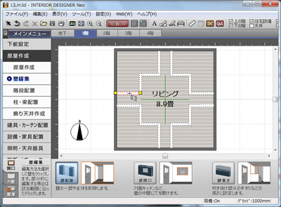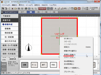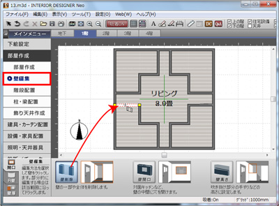 | 07 | 「壁編集」の「壁削除」を選択して、頂点移動した部屋の内側の壁をクリックして削除します。 | ![]() |