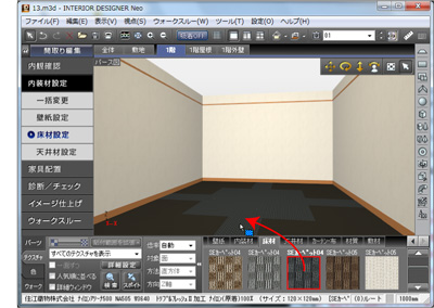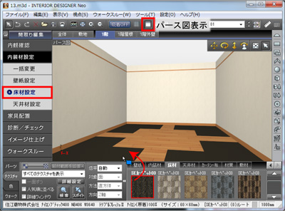 | 10 | パース図表示にして、床材設定を選択し、床材のテクスチャを貼ります。 | ![]() |