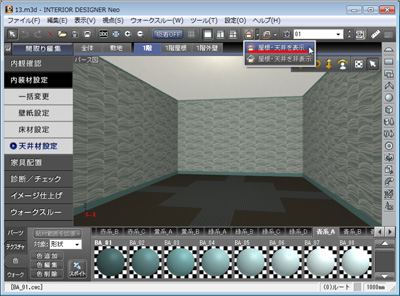 | 12 | 天井を表示させ、床材にあわせた天井材と壁紙を貼り幅木や廻り縁の色を変更して終了です。 | ![]() |
